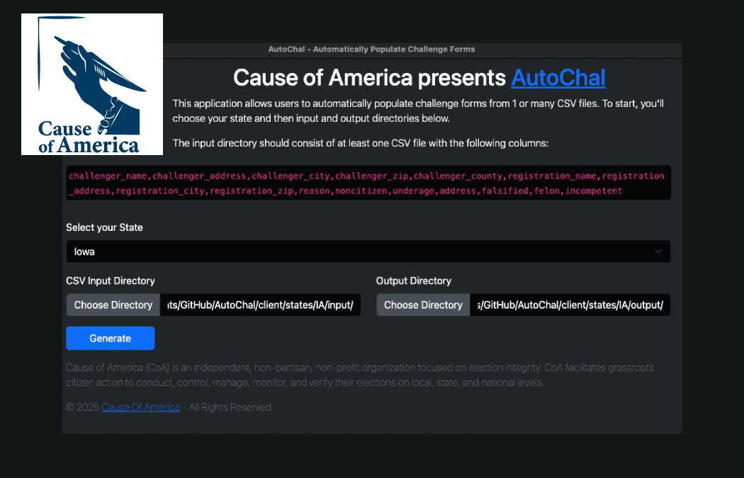 Generate State compliant voter registration challenge forms in bulk. Each state has a different set of required columns which are defined by the state's statutes. This ElectronJS desktop application takes an input file and will generate state-compliant PDF challenge forms for each record included in the input file.