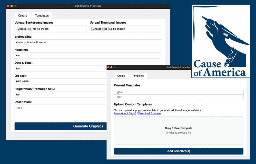 An extendable Electron desktop application which takes in required fields and outputs multiple variations of promotional graphics intended for social media. The application allows end users the flexibility to add additional variations without needing an application update.