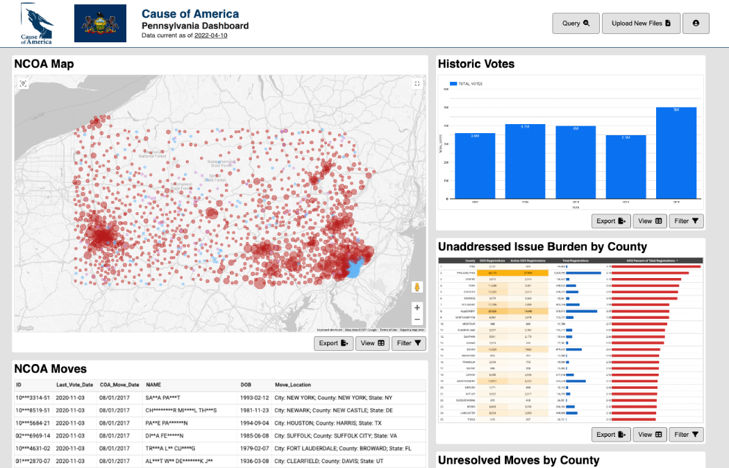 Automatically generate a PDF voter roll report from NCOA data, highlighting pertinent election integrity related findings over ten plus pages. In addition to the PDF, many graphs and visuals are provided as well as the raw data that goes into each category within the report.