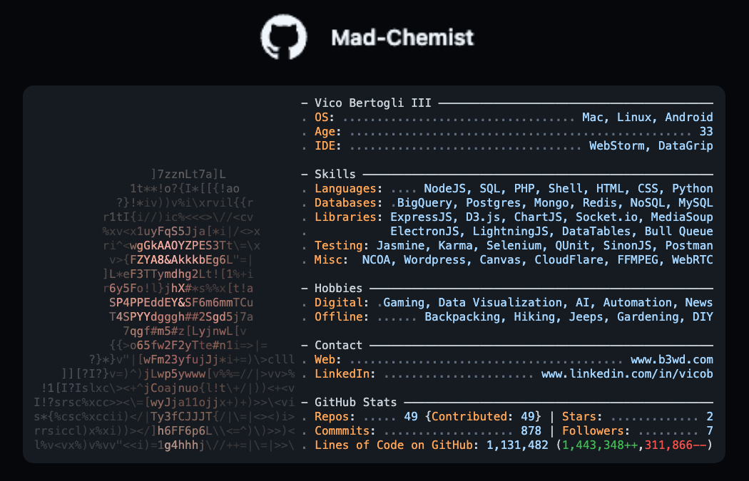 My personal GitHub repository. GitHub action automates and calculates repositories, commits, stars, followers, and total lines of code contributed. Additionally ingests current GitHub avatar, removes the background, and converts it into Ascii art.