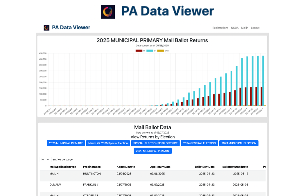 A web application that allows designated users to access ingested Pennsylvania voter data and mail ballot returns for easy analysis. The application provides several reports and interactive charts to better understand the data being viewed.