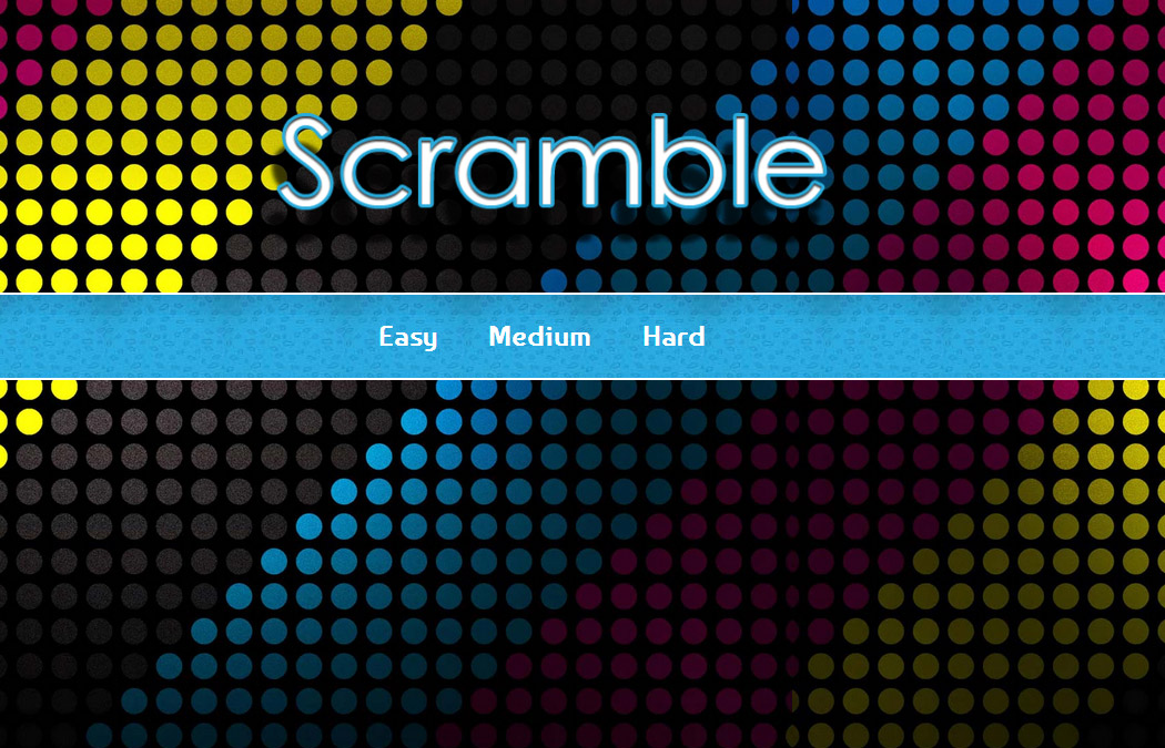 Scramble is a game that started as a project for one of my classes. In the game, you are given a jumbled up word and tasked with unscrambling it. Depending on how quickly you are able to accomplish this, you are given a different number of points. After a set time, you will be given a hint if you cannot unscramble the word.